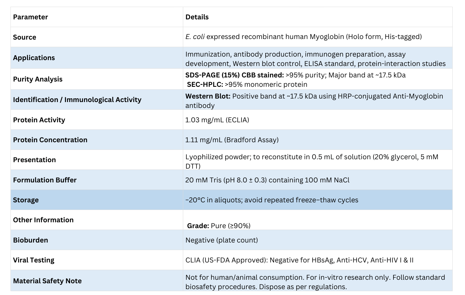 This recombinant human Myoglobin (Holo form, His-tagged) is a highly purified protein preparation suitable for immunization, immunogen preparation, assay development, antibody generation, and immunochemical applications. The product is lyophilized from an aseptically filtered formulation containing 20 mM Tris (pH 8.0 ± 0.3) with 100 mM sodium chloride. Manufactured in E. coli, the protein is supplied at high purity (>95% by SDS-PAGE and SEC-HPLC), making it ideal for sensitive analytical and research applications.